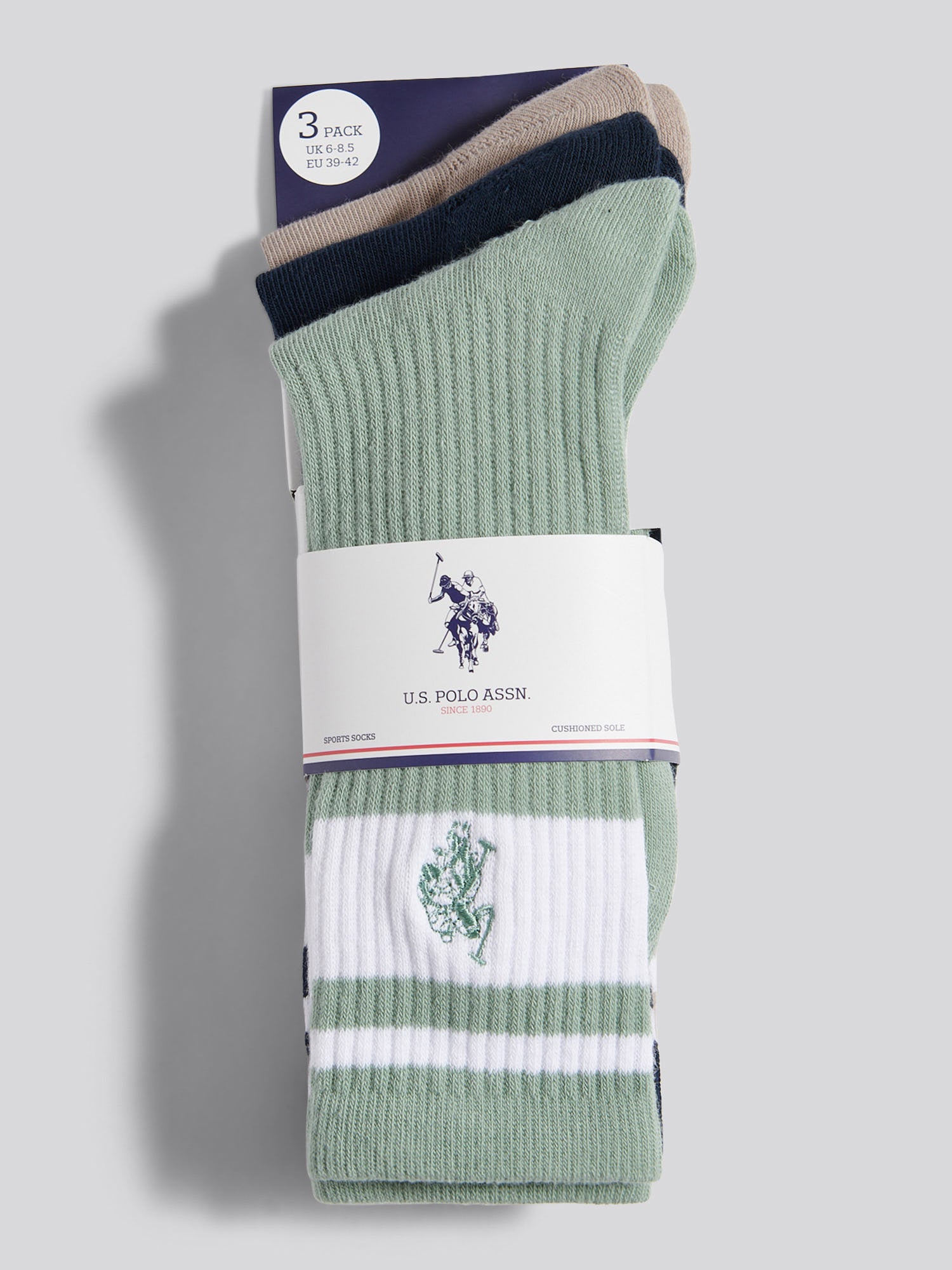 For refined comfort that goes the distance, reach for the U.S. Polo Assn. 3 Pack Fashion Brand Stripe Sports Socks. These cushioned styles are crafted for versatility, whether you're heading out in trainers or lounging in loungewear. Wear them with your go-to kicks and rolled-up trousers to show off the signature jacquard stripe detail.
