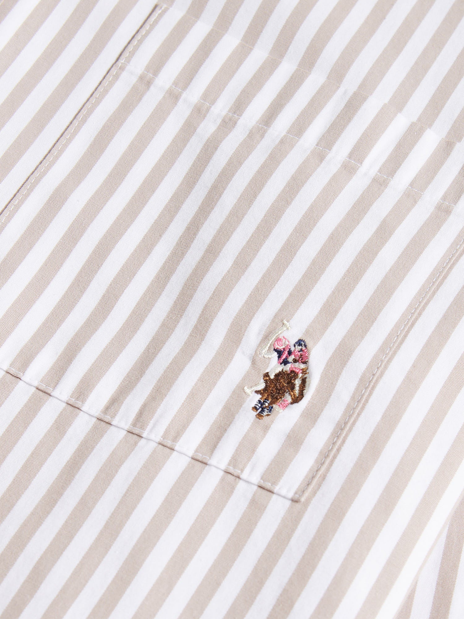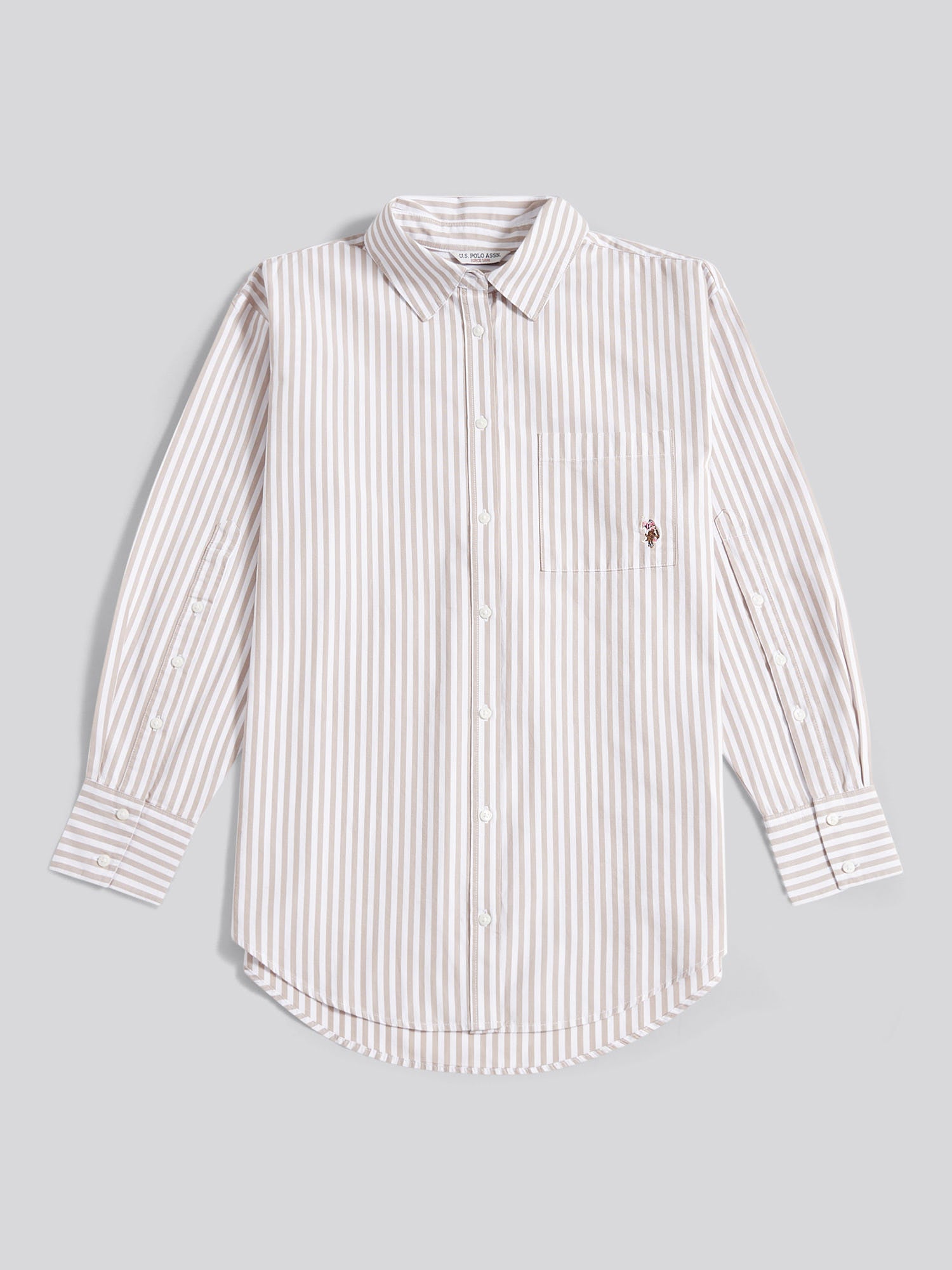 Combining timeless tailoring with a relaxed attitude, the U.S. Polo Assn. Womens Cotton Poplin Loose Fit Stripe Shirt delivers effortless polish. Featuring contrast directional stripes, a dropped shoulder silhouette, and classic detailing, it’s ideal styled loose over a vest and wide-leg trousers or half-tucked into jeans for laid-back refinement.
