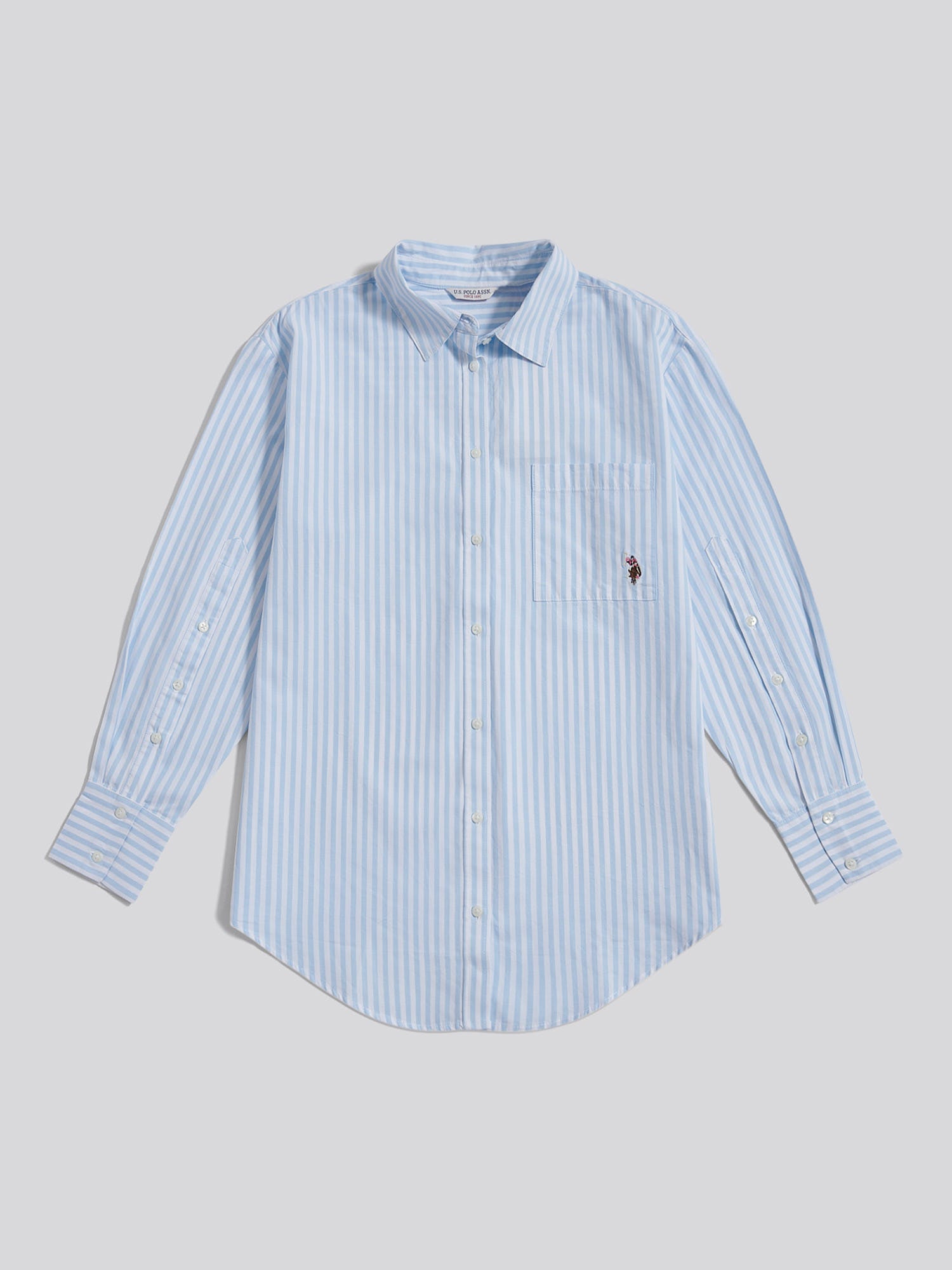 Combining timeless tailoring with a relaxed attitude, the U.S. Polo Assn. Womens Cotton Poplin Loose Fit Stripe Shirt delivers effortless polish. Featuring contrast directional stripes, a dropped shoulder silhouette, and classic detailing, it’s ideal styled loose over a vest and wide-leg trousers or half-tucked into jeans for laid-back refinement.