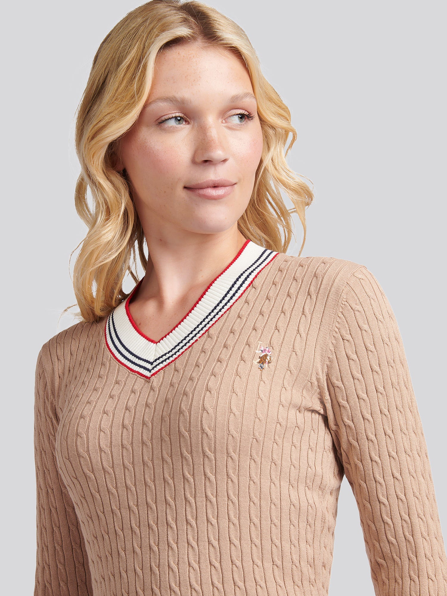 Womens Fine Cable Contrast V-Neck Jumper in Natural