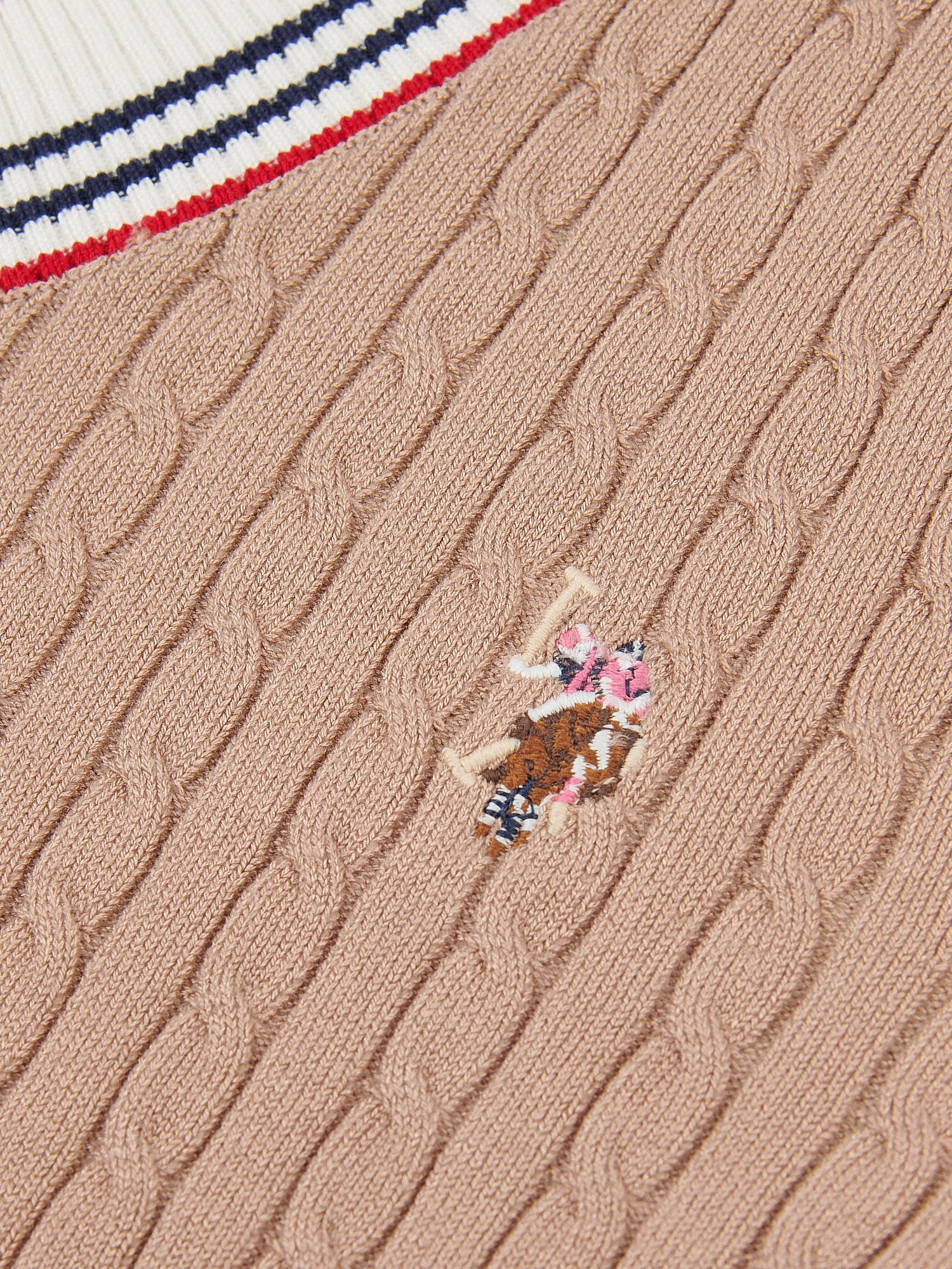 Combining heritage design with modern flair, the U.S. Polo Assn. Fine Cable Contrast V-Neck Jumper lends refined depth to any everyday wardrobe. Featuring our signature cable knit and a contrast-tipped neckline, it’s a standout piece with timeless appeal. Style it with tailored trousers or dark denim for a polished take on transitional dressing.