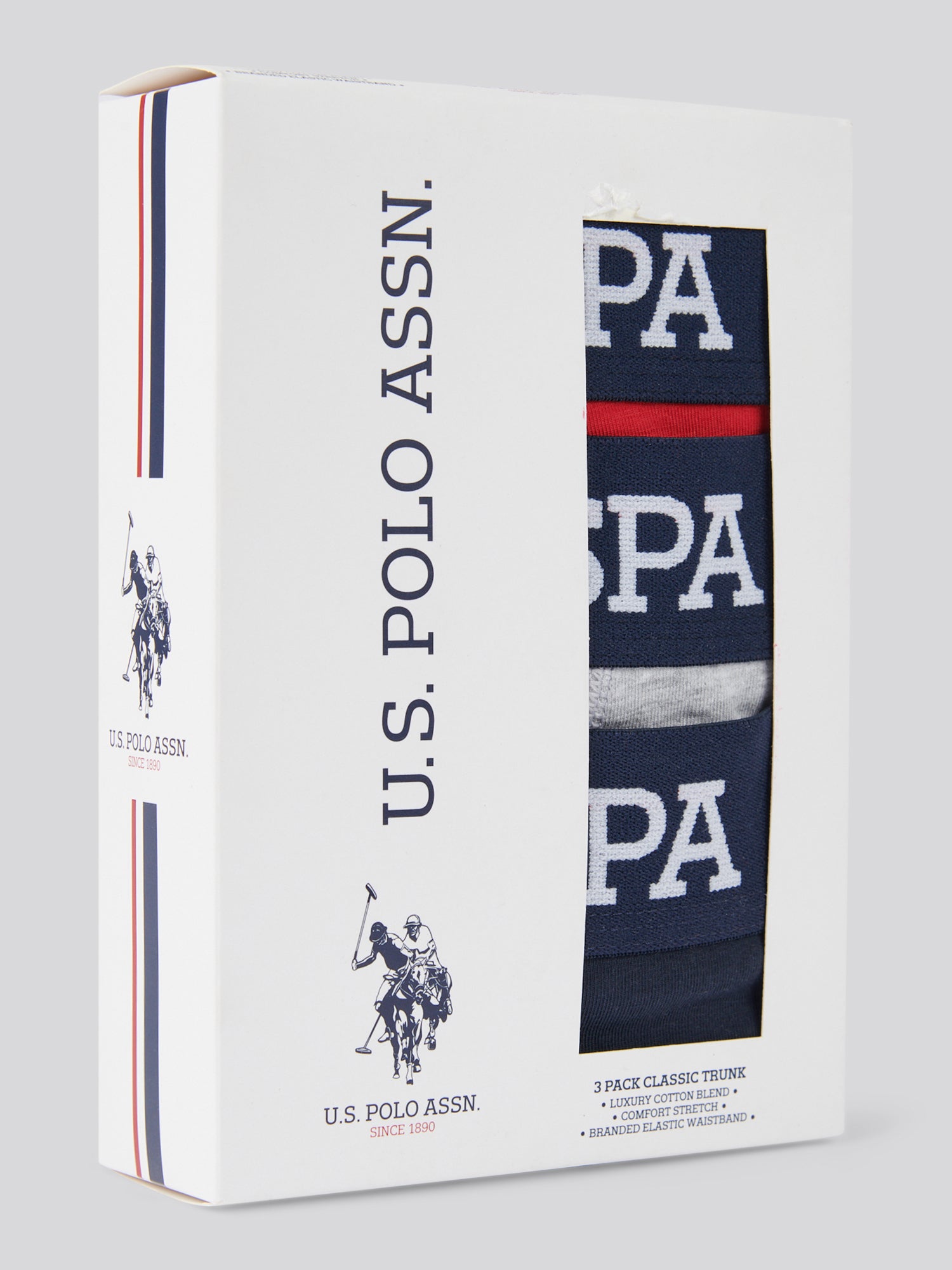 These U.S. Polo Assn. mens 3 Pack Branded Stripe Boxer Shorts deliver essential comfort and a touch of style. Made from a soft cotton blend with added stretch, these boxers ensure a secure, comfortable fit all day. The branded elastic waistband and signature stripe design provide a refined finish, ideal for the modern man.