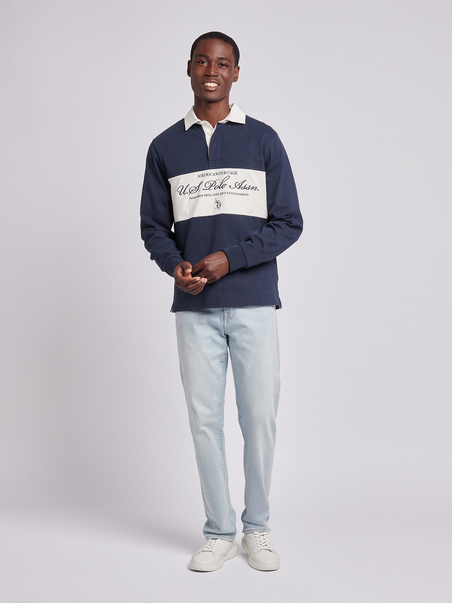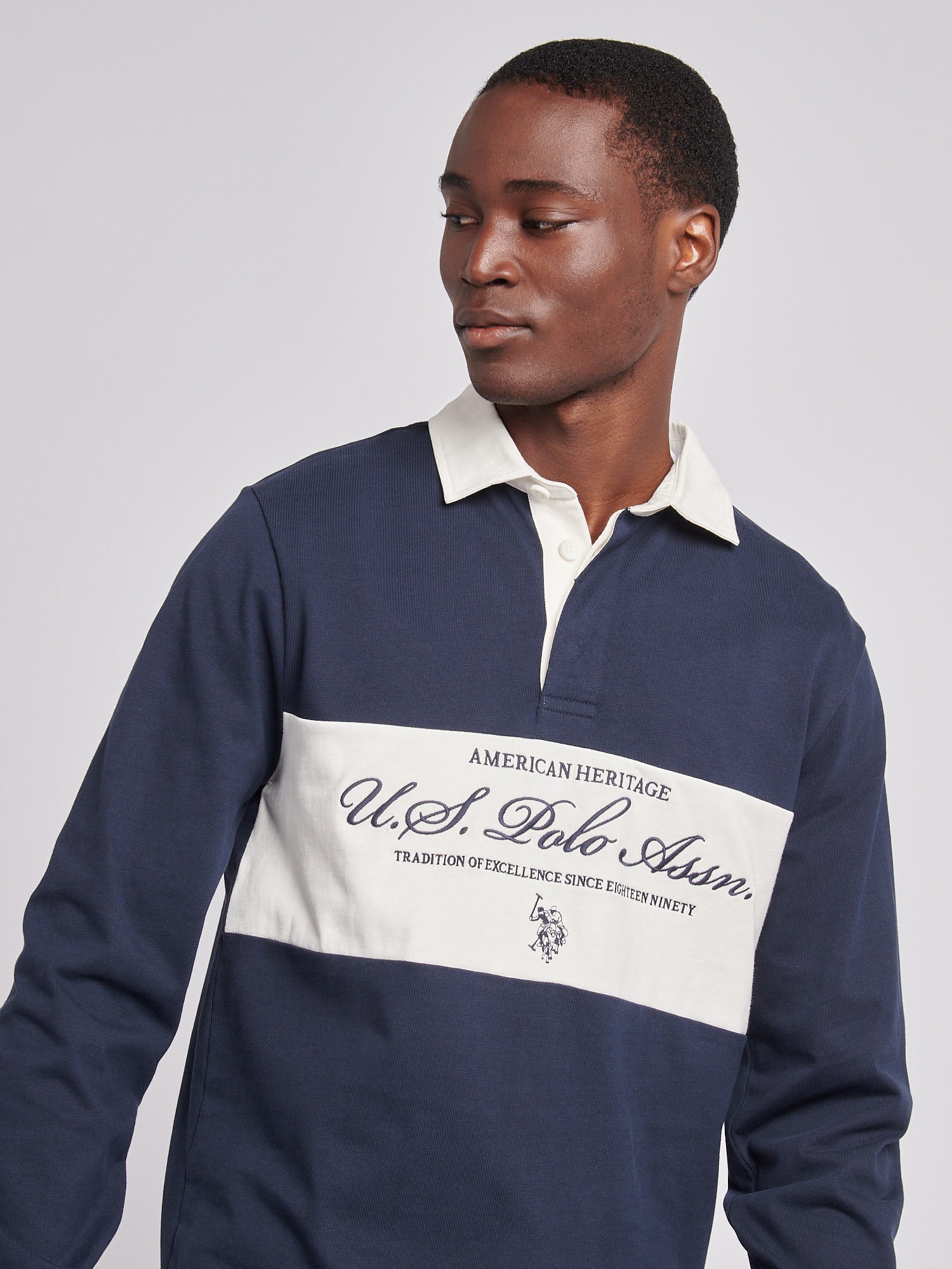 The mens Premium Embroidery Graphic Rugby Shirt by U.S. Polo Assn. brings together classic rugby style with a sophisticated, elevated edge. Crafted from soft, heavy jersey fabric, it features refined details and premium embroidery, making it a standout choice for any wardrobe. Pair it with chinos for a smart-casual look or wear with jeans for a relaxed yet polished outfit.