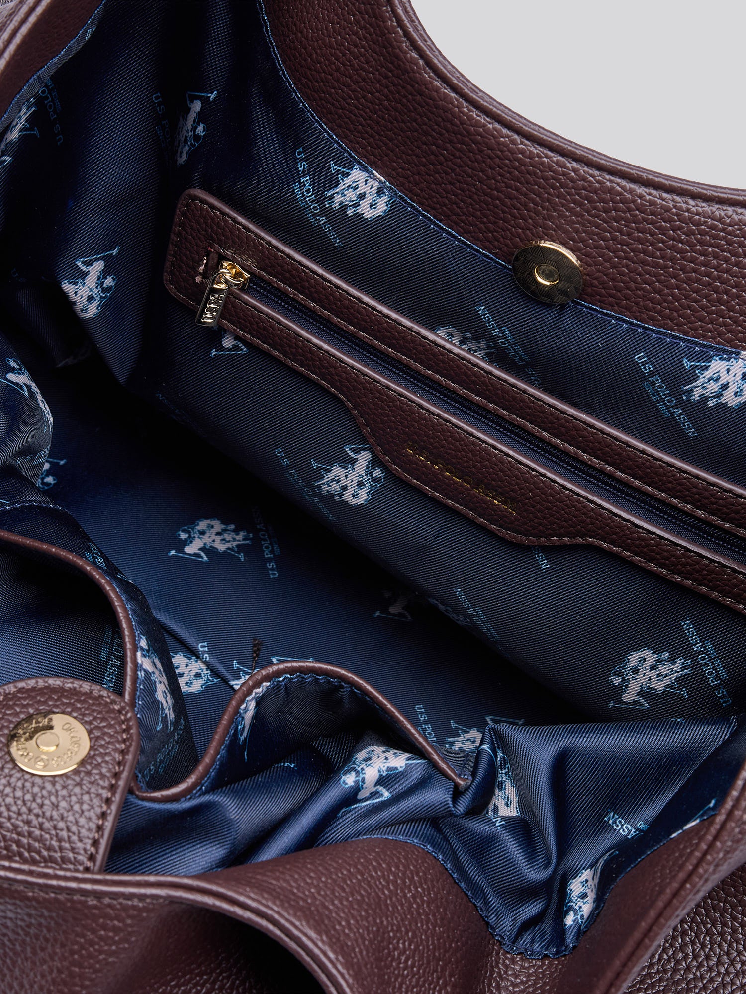 - Metal logo hardware: Refined branded detail