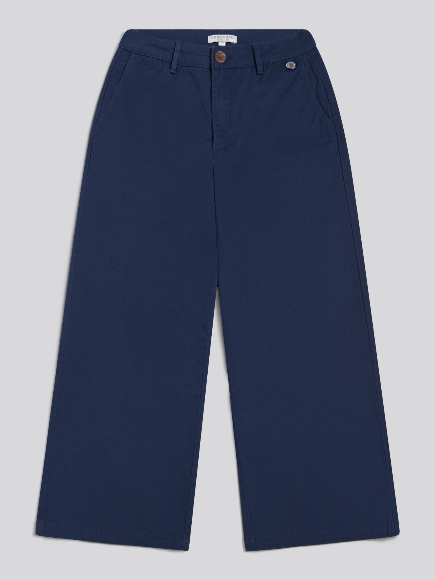 Embrace casual sophistication with these U.S. Polo Assn. Womens Ankle Wide Leg Chino Trousers, crafted for a relaxed yet refined look. Pair with a tucked-in tee or a lightweight knit for an effortlessly polished style.