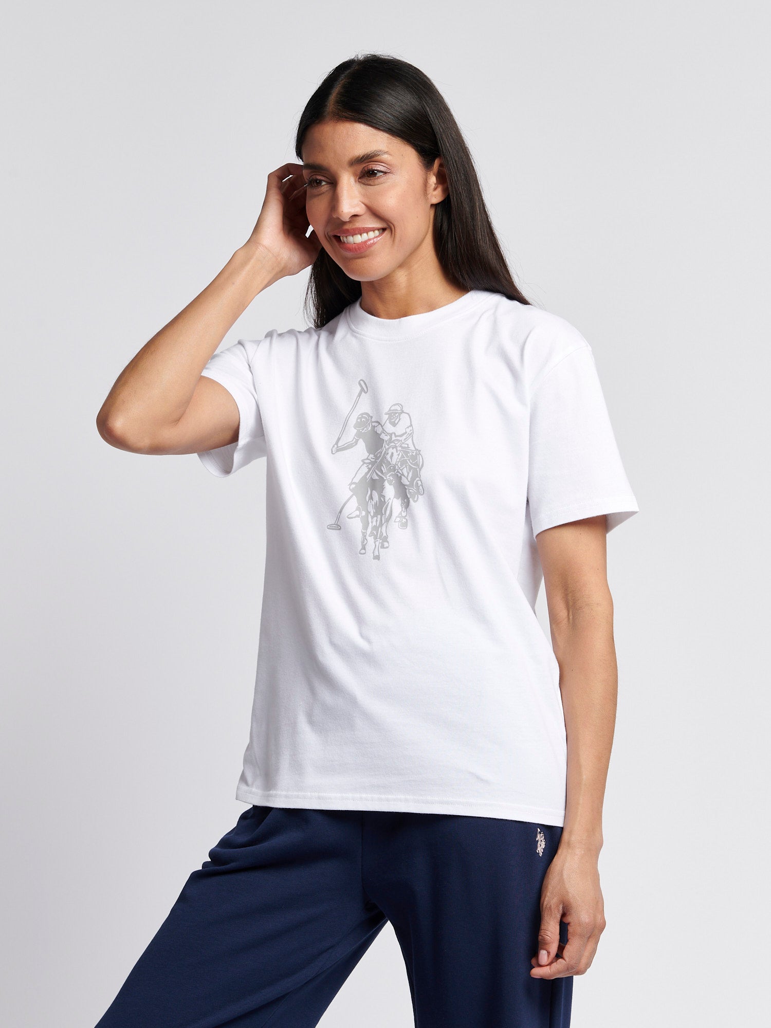 Embrace a bold statement with the U.S. Polo Assn. Womens Double Horsemen Print Crew Neck T-Shirt, where heritage meets modern style. The iconic Double Horsemen print adds an elevated touch to a relaxed silhouette, making this tee a versatile addition to your casual wardrobe.