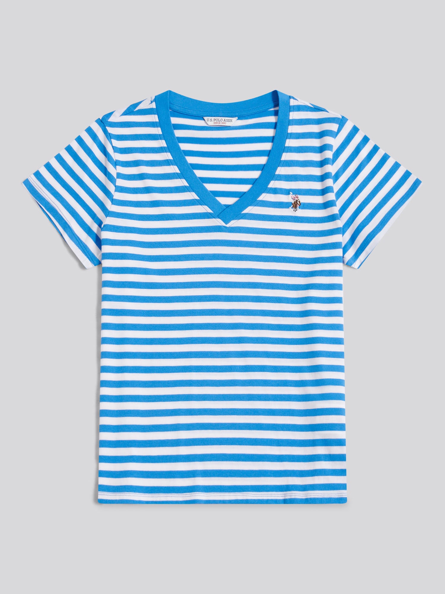Step into effortless style with the U.S. Polo Assn. Womens Stripe V-Neck T-Shirt. Perfect for casual days, this tee adds a touch of sophistication to your look. Pair with jeans or chinos for an effortlessly chic outfit.