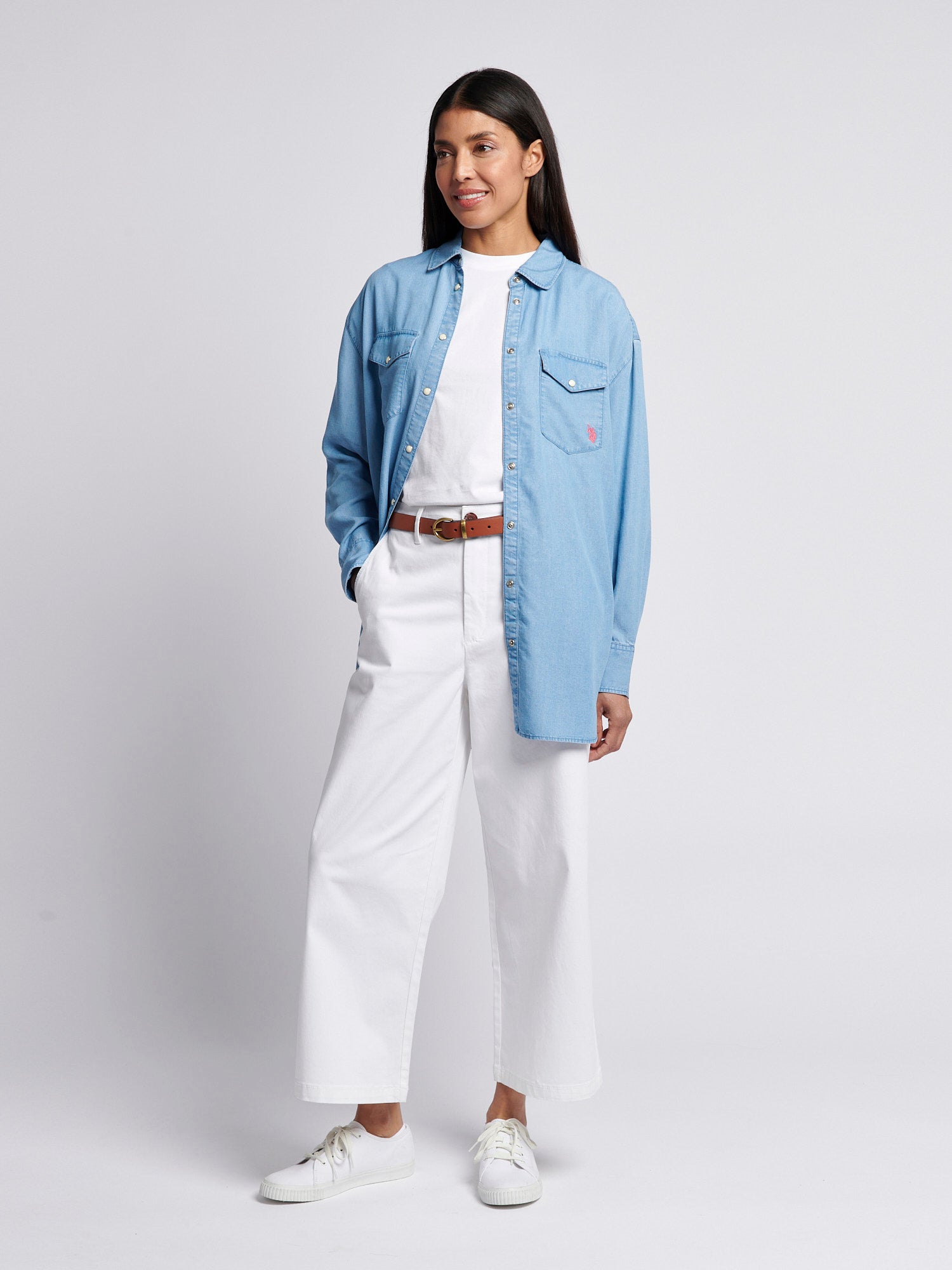 Effortlessly balancing structure and ease, the U.S. Polo Assn. Womens Chambray Overshirt is a refined essential with a laid-back edge. Its laundered finish and premium detailing offer a polished yet relaxed look, perfect worn open over a tee or buttoned up with wide-leg jeans for a contemporary silhouette.