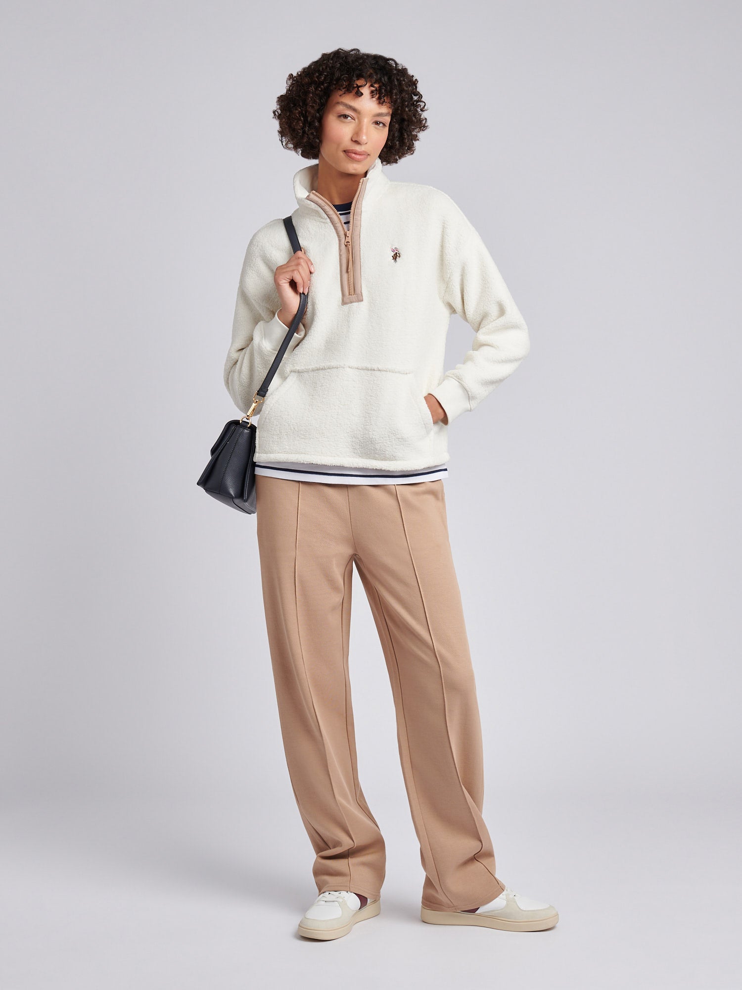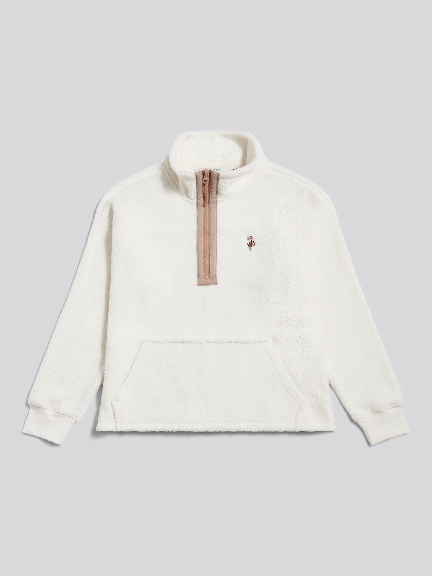Layer up in heritage-inspired comfort with the U.S. Polo Assn. Womens Double Horsemen Borg 1/4 Zip. This textured staple brings a refined twist to casual dressing, featuring a clean funnel neck and contrast piping that elevate the everyday. Style it with wide-leg trousers and leather trainers for an off-duty look that still feels polished.