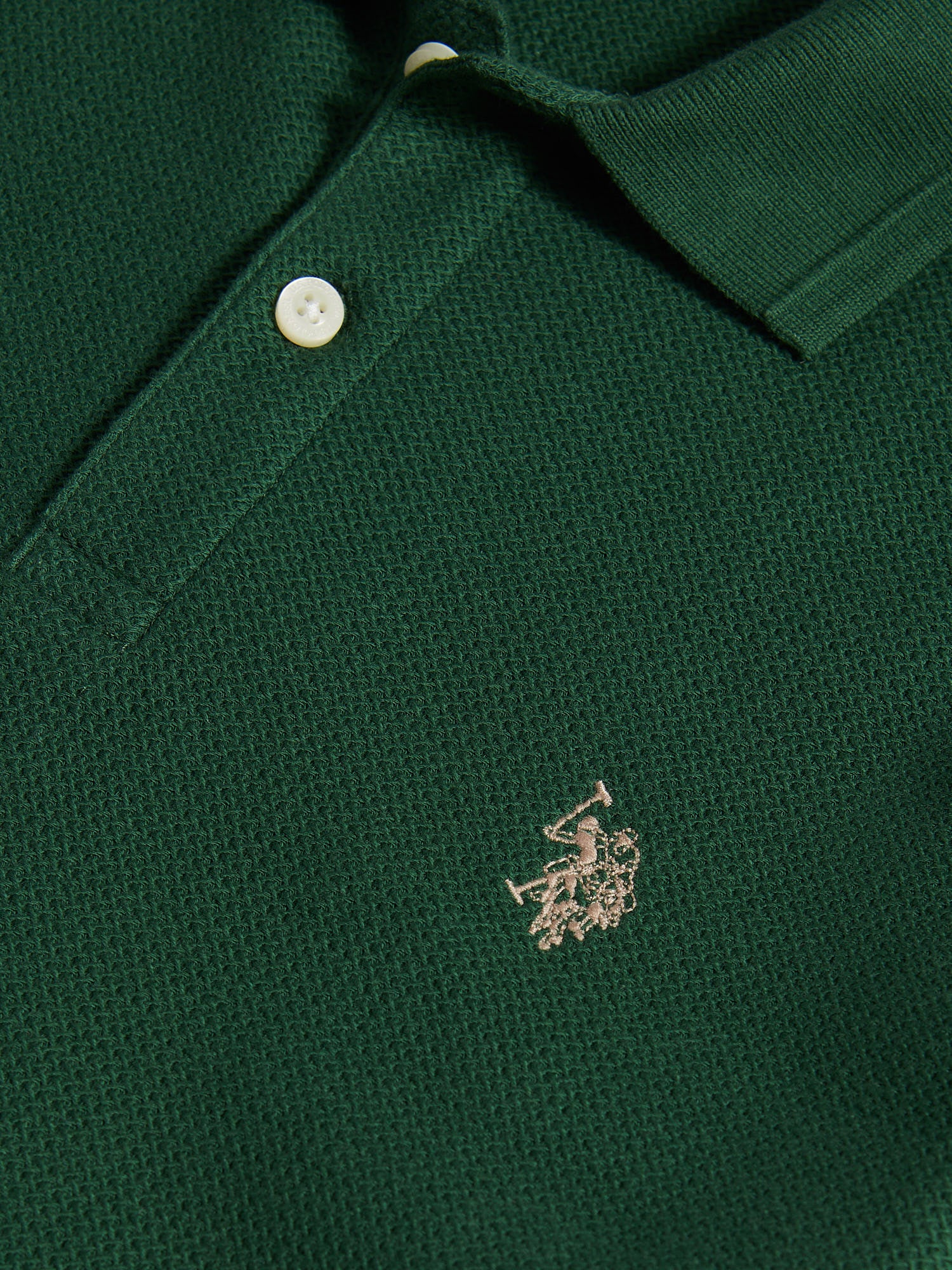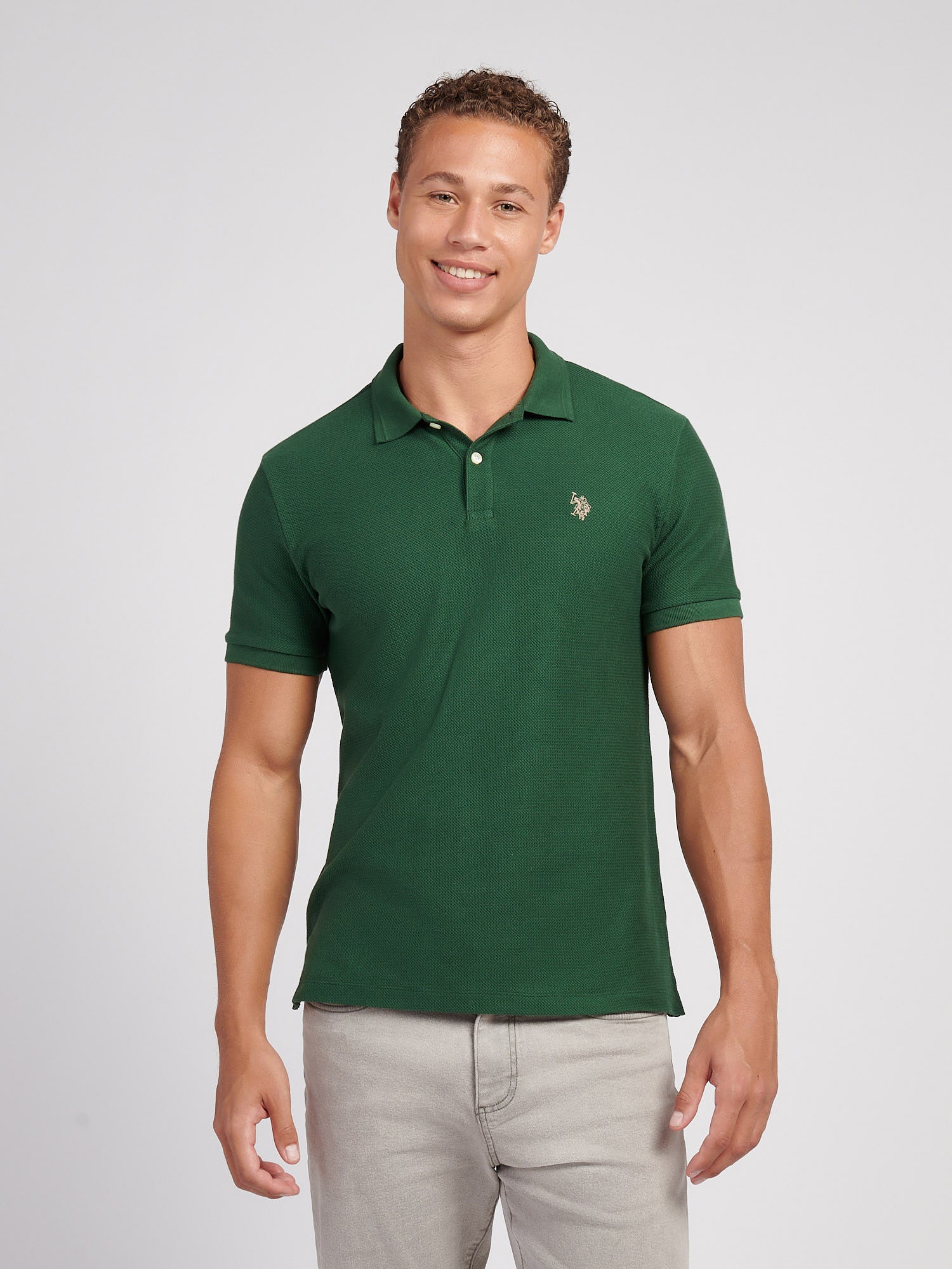 For days that call for something elevated yet effortless, the U.S. Polo Assn. Mens Herringbone Texture Polo Shirt is a refined essential. Designed with subtle herringbone texture across the body and a crisp flat knit collar, it brings depth and character to everyday outfitting. Team it with smart chinos and loafers for an understated take on off-duty polish.