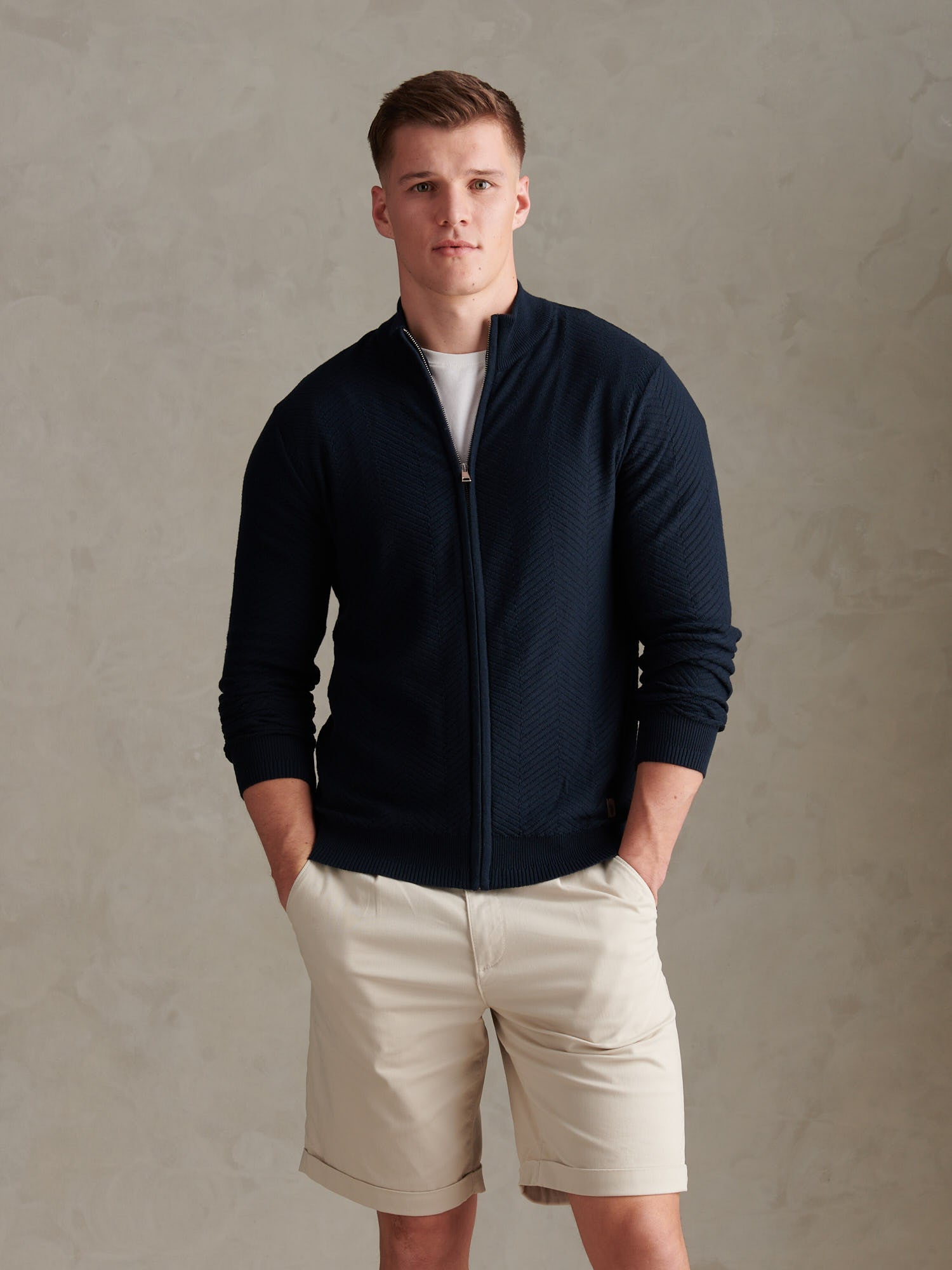 Large Scale Herringbone Full Zip Funnel Dark Sapphire Navy