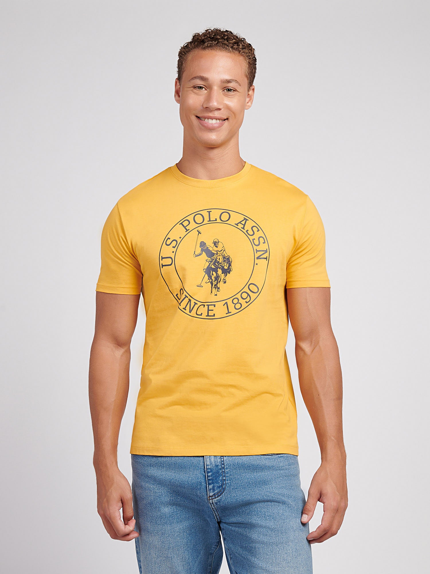 Elegancki, swobodny element garderoby, U.S. Polo Assn. Męska koszulka USPA z nadrukiem okręgu wprowadza nowoczesny akcent do kultowego projektu. Ta wygodna koszulka wykonana w 100% z bawełny ma odważną grafikę okręgu, która nawiązuje do dziedzictwa marki. dżinsy lub chinosy, aby uzyskać wszechstronny wygląd, który jest bez wysiłku klasyczny. Połącz z kurtką dżinsową, aby uzyskać swobodny, ponadczasowy klimat.