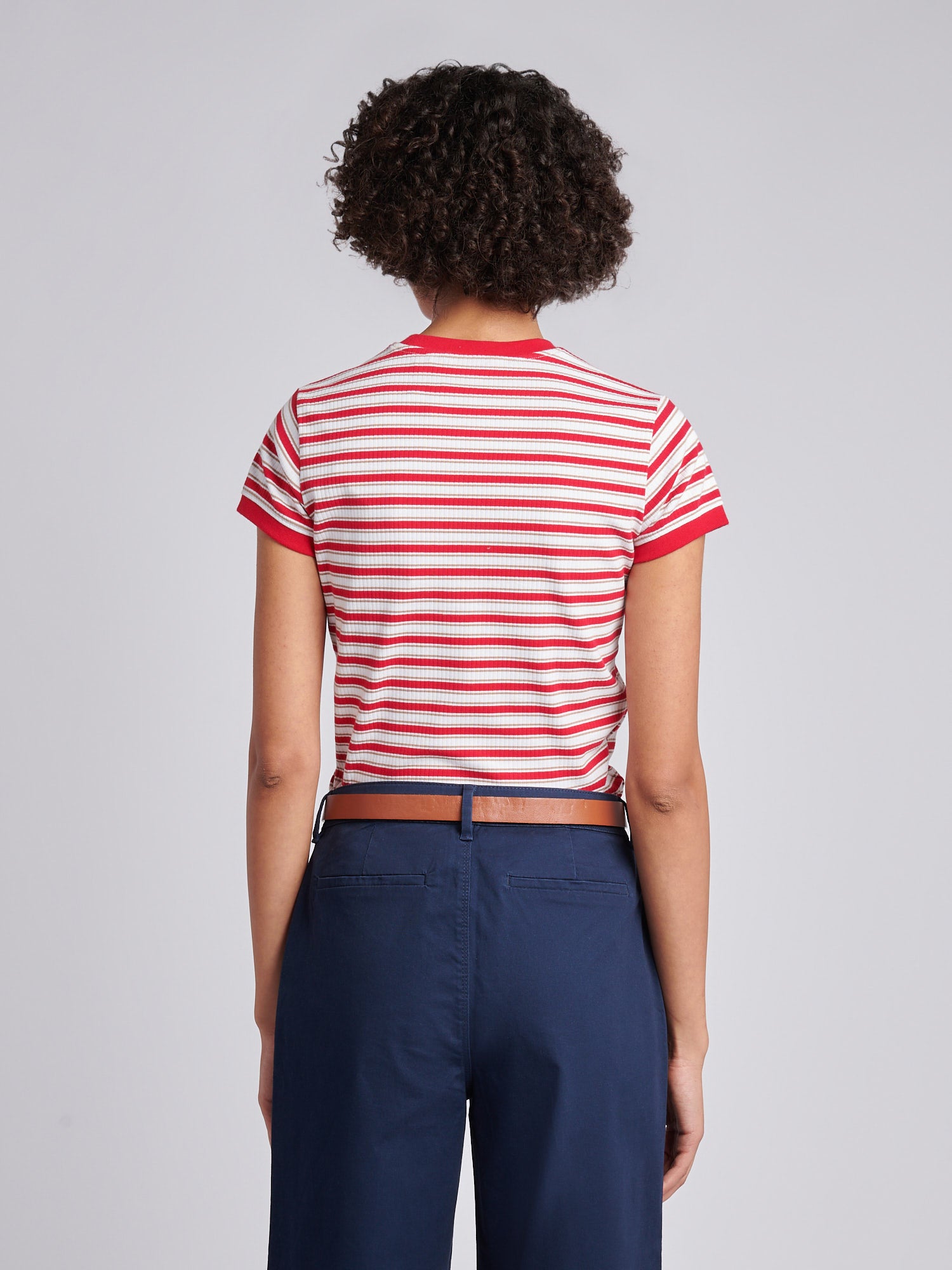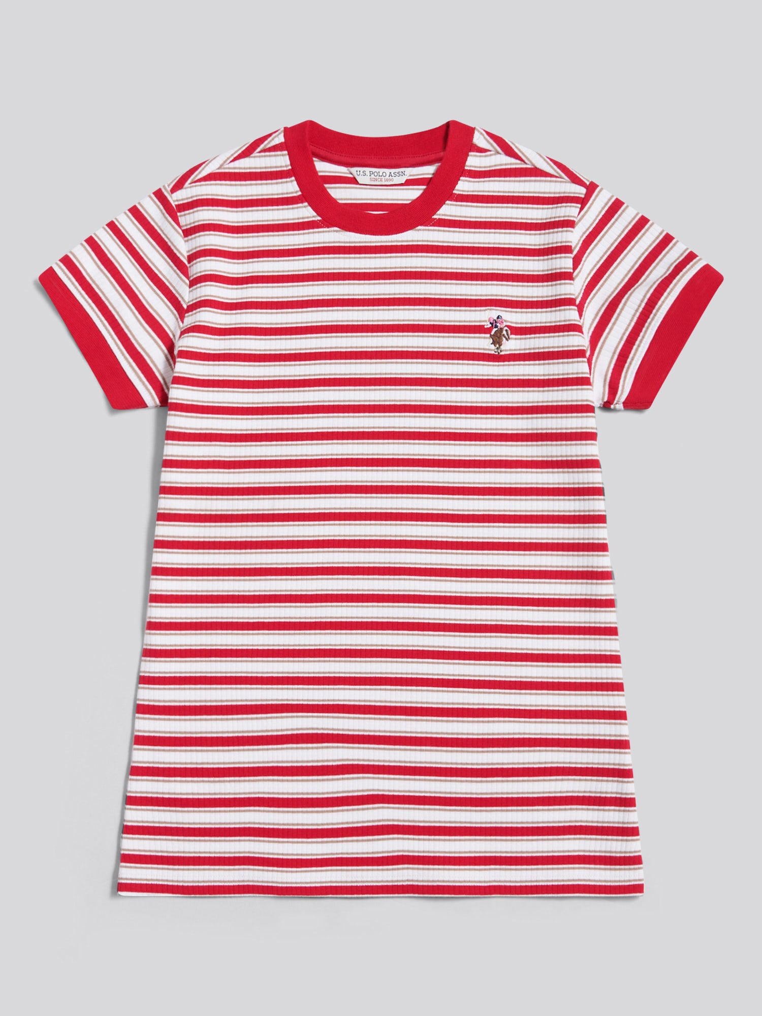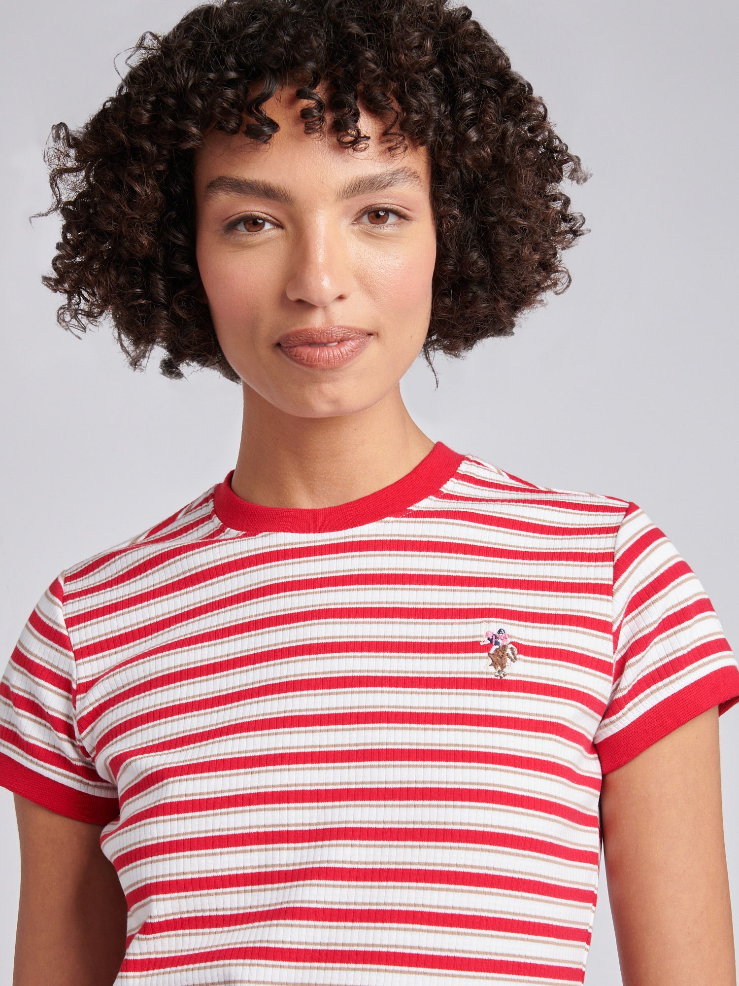 Channelling a sporty heritage aesthetic, the U.S. Polo Assn. Womens Stripe Rib T-Shirt makes an everyday statement with ease. Featuring a bold yarn-dyed stripe and signature embroidery, it brings a vibrant energy to any casual look. Pair it with relaxed jeans or wide-leg chinos for off-duty styling with a refined twist.